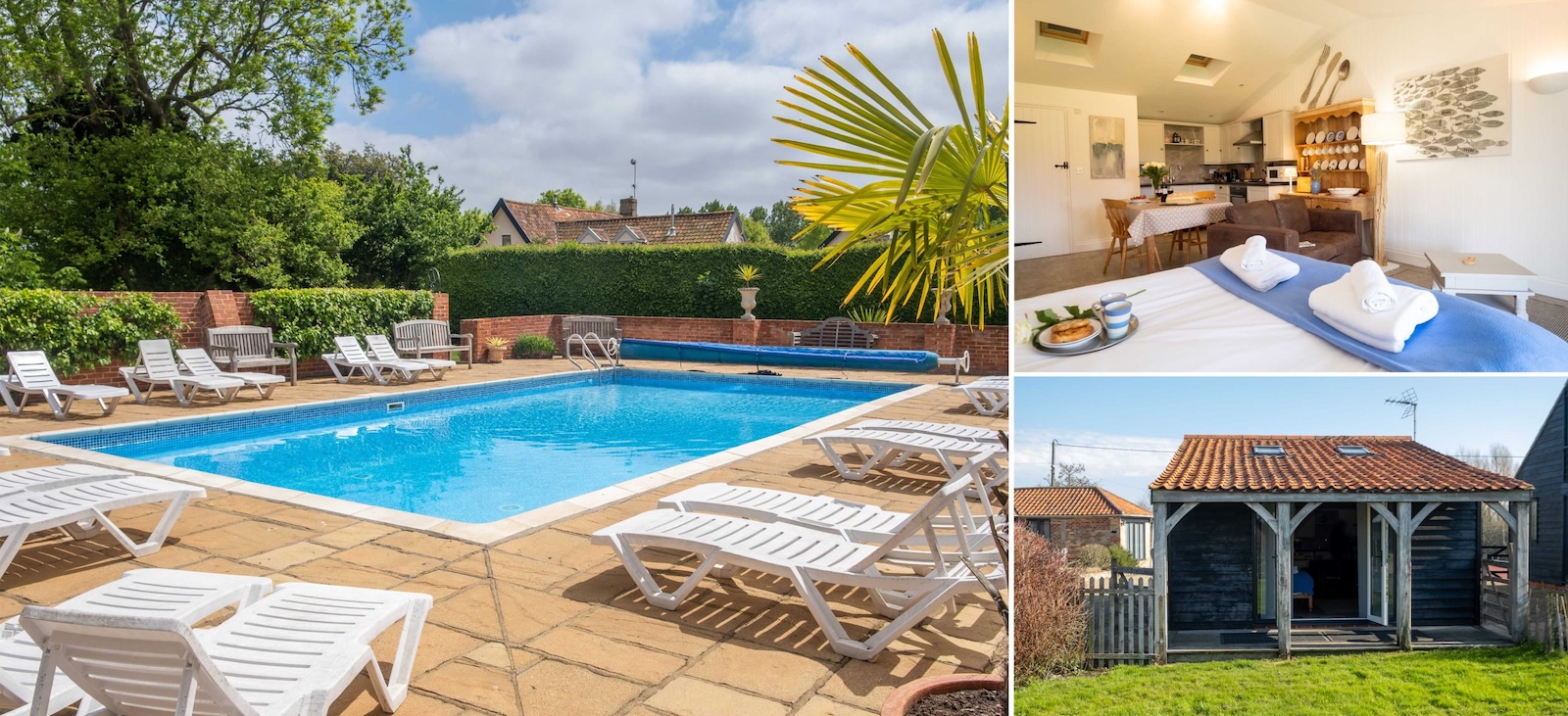 Close to the well-known seaside towns of Southwold and Aldeburgh and just a few miles from the beautiful heritage coast with beaches and outstanding walks. These eco-friendly cottages are set in thirteen acres of paddocks and meadows with a tennis court available all year round (please bring your own rackets and balls) and outdoor heated swimming pool (available May – September from 9.00am – 5.30pm) The properties offer peace and tranquillity and a safe play area for children to roam free while adults can relax and unwind.