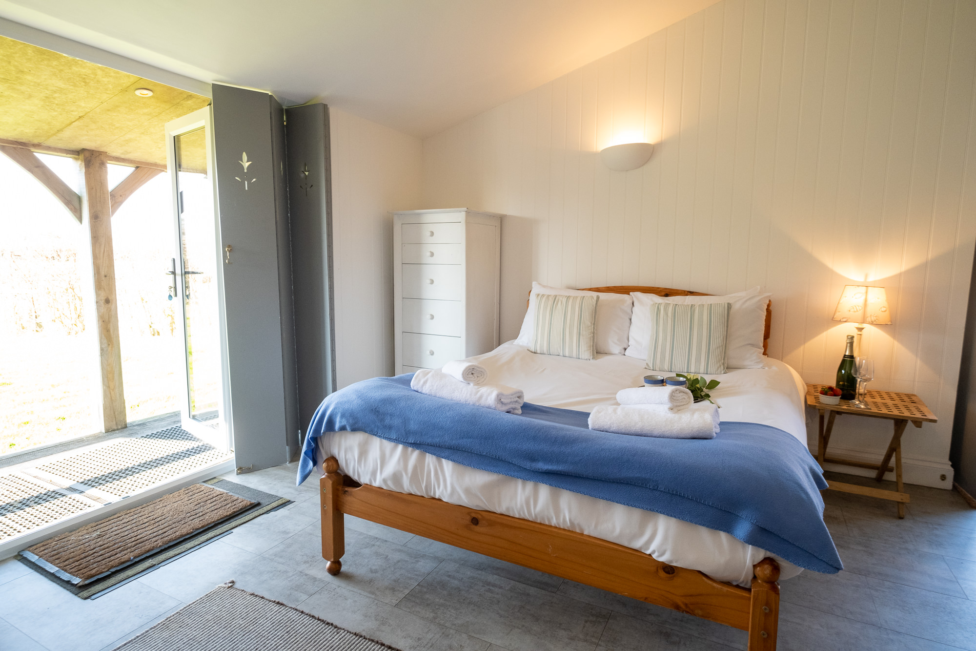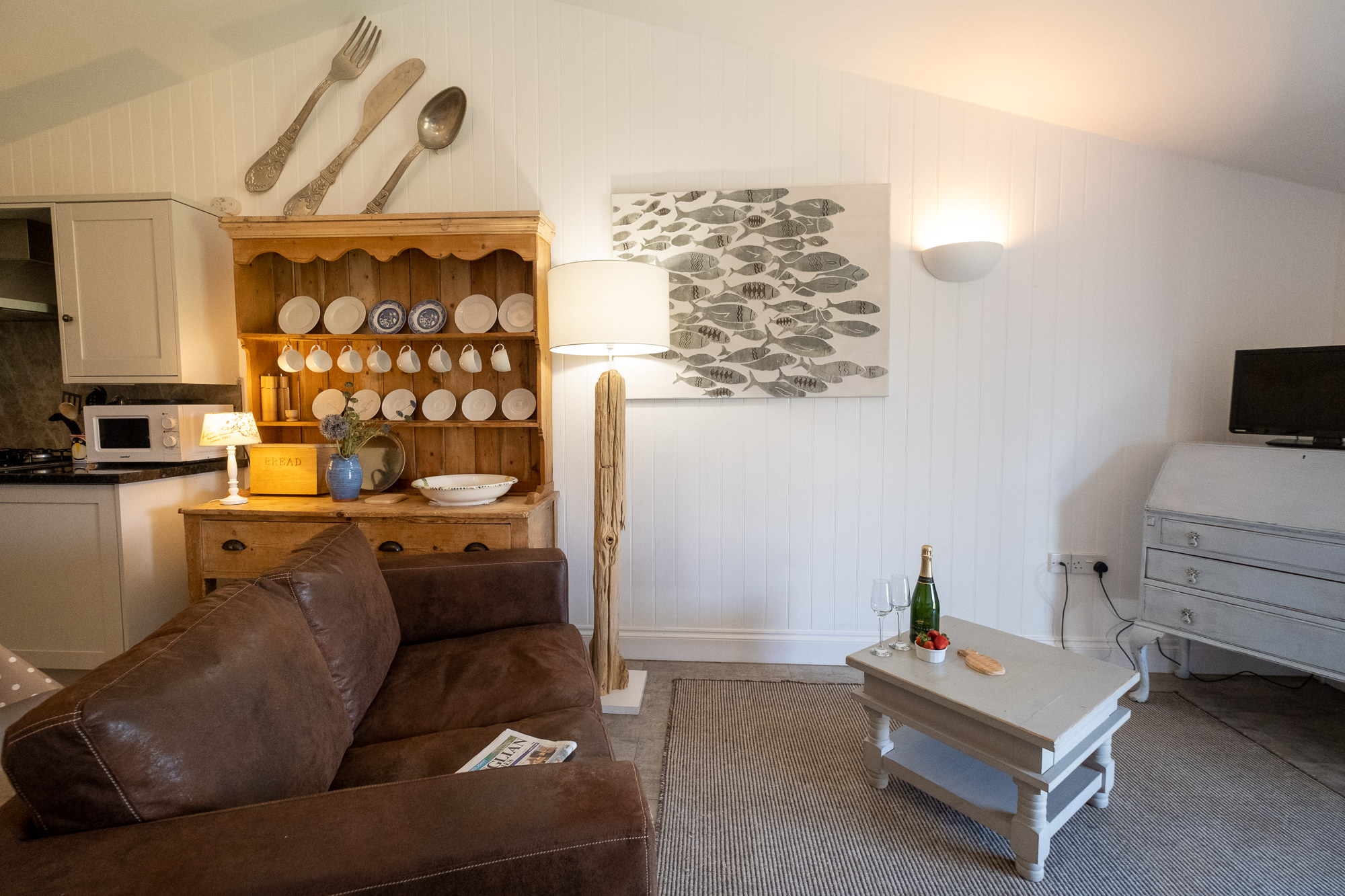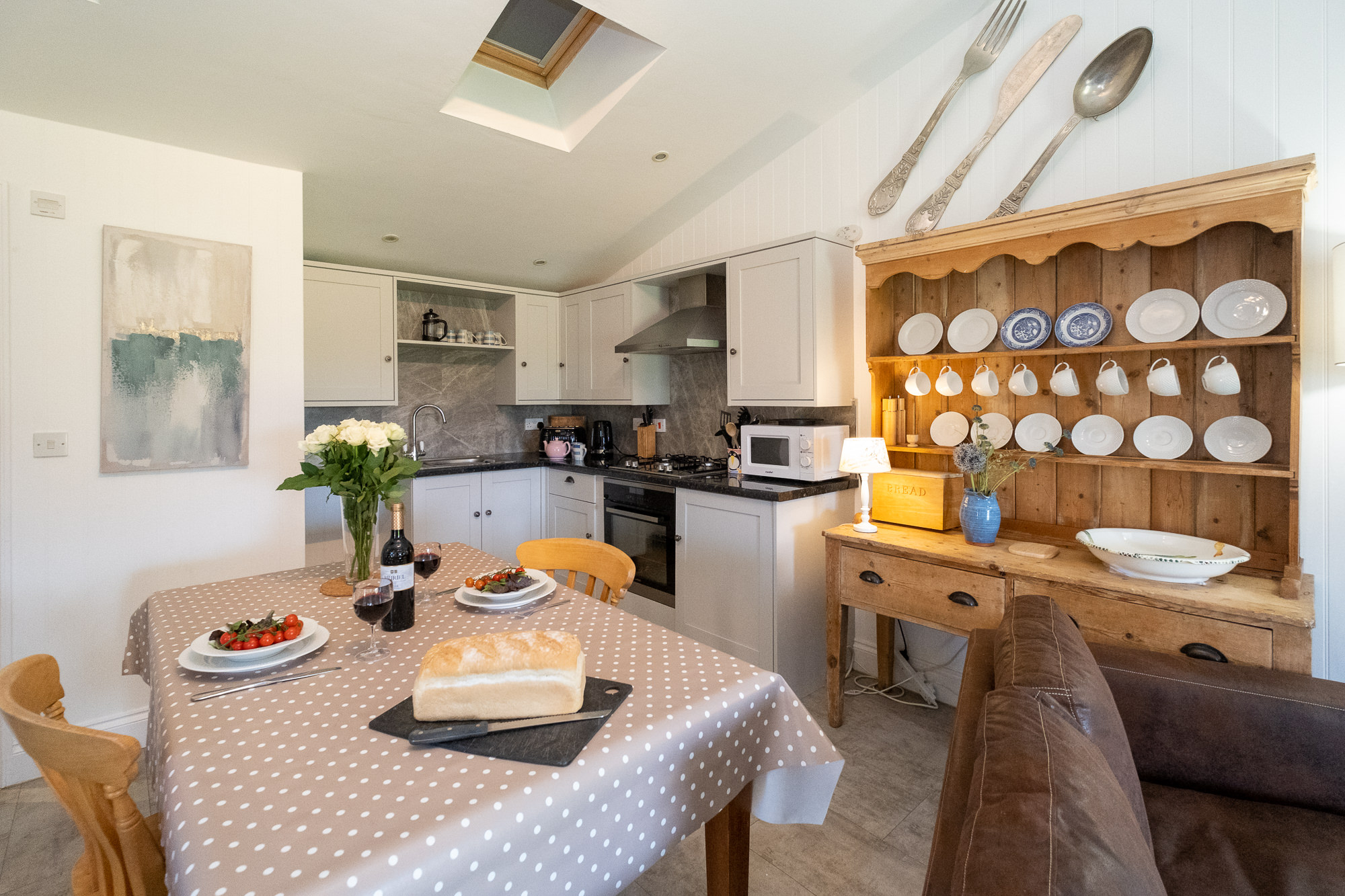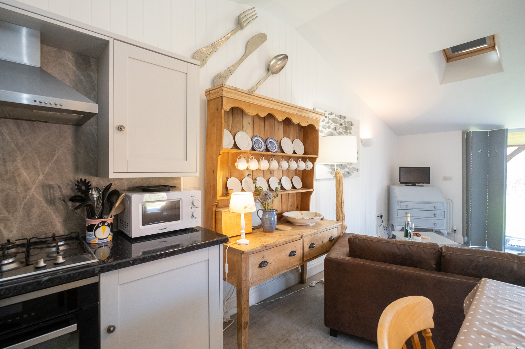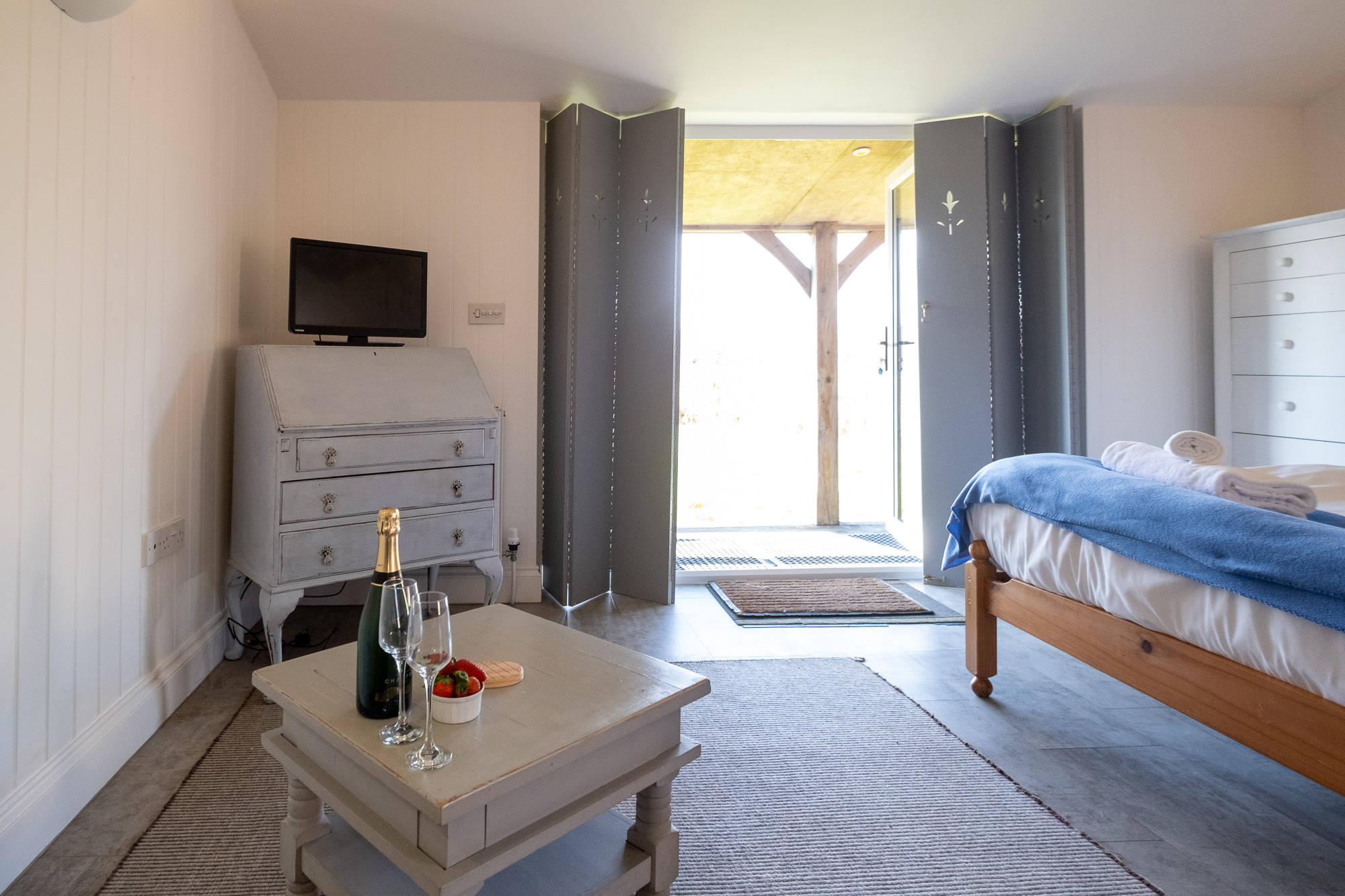The bright open plan sitting room offers a TV with Freeview, comfy sofas and a kitchenette. There is also a double bed and a shower room. All on one level.