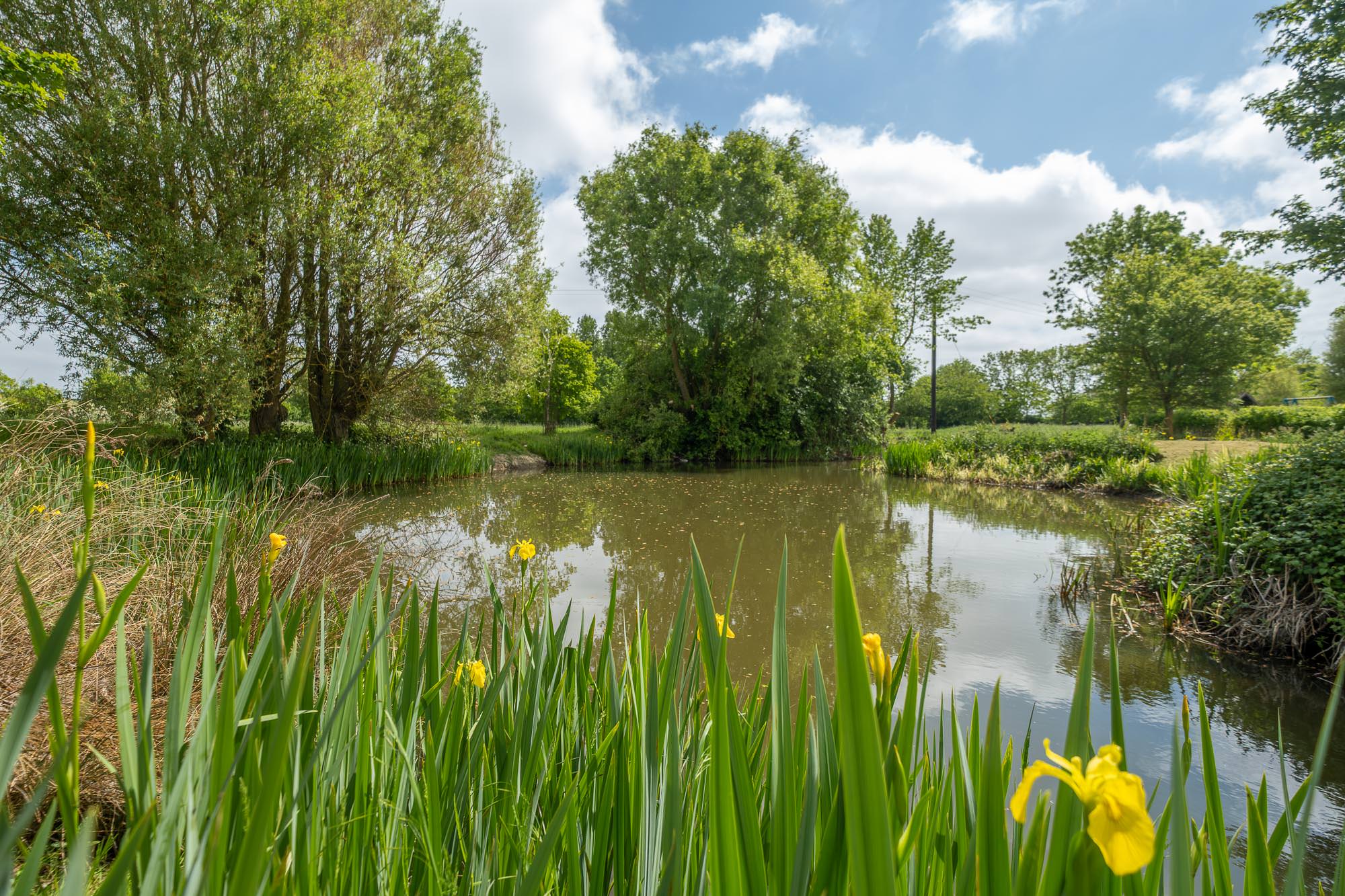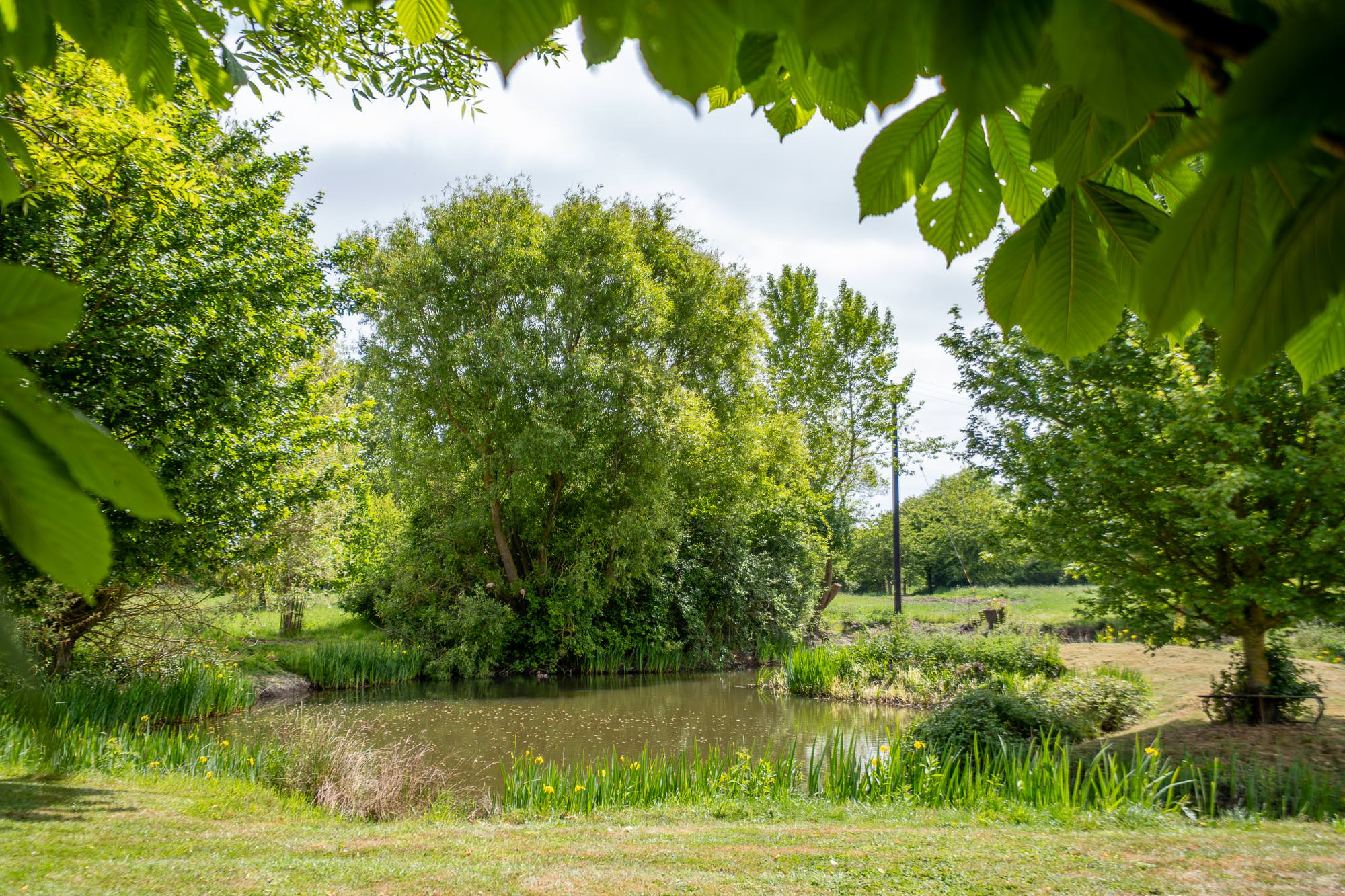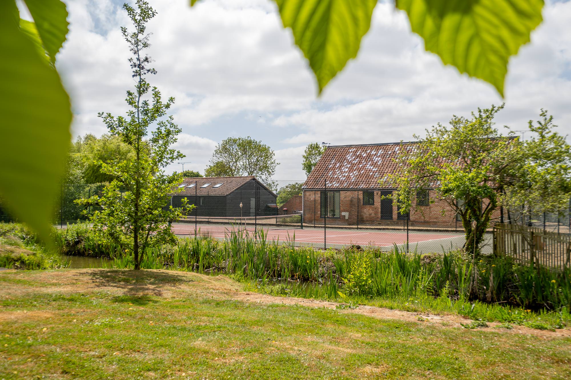 Spacious, light and converted to a high standard, The Dairy is a two-story converted barn with large barn windows overlooking the tennis court with the pond beyond.